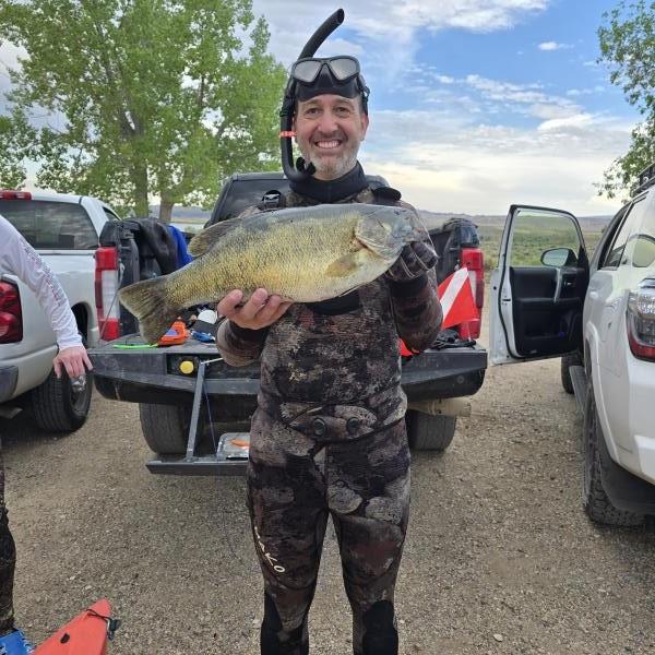 Mike Livingston and I went to a small cove in flaming gorge, where we spent the morning spearfishing. We did not see a lot of large fish, but we did see a lot of small trout, as well as small mouth bass, we were able to shoot a handful of fish, but most of them were relatively small. Later on in the afternoon, we decided to go spearfishing.One more time during the evening near our camp. We did not see a lot of fish. We were about 30 or 40 feet out from shore when I saw 4 or 5 small mouth bass underneath me, the visibility wasn't great. So I dove down and waited for a few seconds at that moment. One of the fish turned sideways, and I shot As I surfaced, I knew it was a big fish and I showed it to Mike immediately, who also was surprised how big it was. We continued fishing for about another hour and a 1/2 and put it on the Stringer. When we got to shore, we both, we're very surprised at the size of the fish and mike suggested that we weigh it to see if it what's close to a record fish. When we got back to camp, we used to hand wear which weighed the fish. Unofficially, the wait came in as a record, and so that morning, I drove down to vernol and went into the smiths, meet and deli to get it officially weighed where it came in at five pounds five ounces.