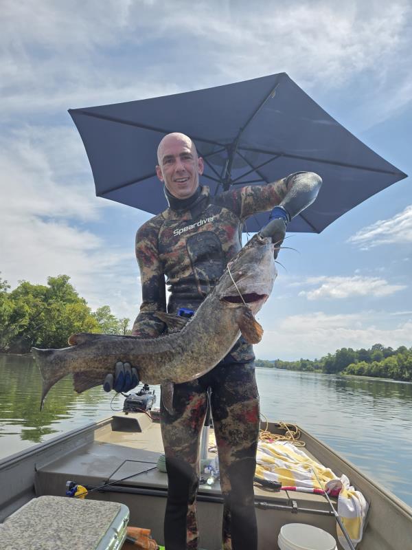 My Fiancé's friend Natalie was was in town from Oregon and me and her were excited to get out and dive. I had been shooting some nice fish the week leading up to that day and Natalie was looking to spear her first fish. The weather was nice but the river as usual had about 3-4 ft of visibility. I ran upriver to one of my best spots below a shoal where it drops off and gets deeper. We had only been in the water for about 10 minutes when i found and shot a nice 30 inch flathead hiding under a stump near the shore. Back in the water I found a submerged tree that had been holding fish regularly. It was about 40 yards from shore and around 12ft deep. I dove down at the downstream end and swam up the length of it to the base of the tree where he was hiding underneath. I put a nice headshot on it but it didn't stone it. It shot out the other side of the log and i wasnt able to wrestle it out before i ran out of breath. I could barely reach the surface while holding my band on my pole spear to get another breath. I dove again, got my hand in his mouth, and swam it back to the boat. After that Natalie landed her first flathead and we were all smiles the rest of the day.