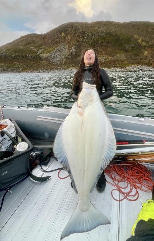 My hands were numb before we even entered the water at dawn above the arctic circle. The cold wind was blowing as we got naked between the doors of a car and poured hot water into our wetsuits. Joel Burman brought a scalding hot water thermos for the rubber boat that we would pour off into our gloves every hour or so to rewarm them. After 8 days of diving in Norway, I finally started getting the eye for the camouflaged fish. A halibut’s outline is all that can first be noticed with my untrained eye against the dark sand or rock that they lay on. I saw it on a flat rock with another fish opposite it, like they were having a chat. I dove down on them twice from a distance so that I could judge which one was thicker or bigger in size. I used a short version (7 feet versus the full sections that bring it to14) of my Redtide carbon fiber roller polespear. It has a dyneema slip tip and we had a 50 foot float line attached to a 1 ATM float. The fish did not fight after a head shot but did run 100 feet. I dove down and shot a second polespear through it as a holding measure but I think that was overkill. I brought it to surface with no issues. At surface, it woke up and drug me down several times before I tied its tail off and brought it to the boat for the last time before cleating it off.