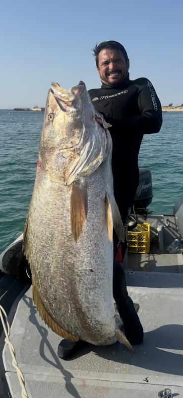 I was diving in my usual spot, it was early, clear and warm water, I dived down to 18 meters and saw a massive seabass really deep, I wasn't ready because it was my first dive so I came back to surface hopping the get a better preparation and go and get that Bass. I dived down again and there was absolutely no fish witch I found strange, so I kept going deeper and then I saw around one big rock this Meagre, she was huge, alone and very slow, I went to the other side of the rock and waited for her, she came in, head first and very calm, I shot her just behind the head at 25,6 meters deep and the dive was 1 minute 38 seconds