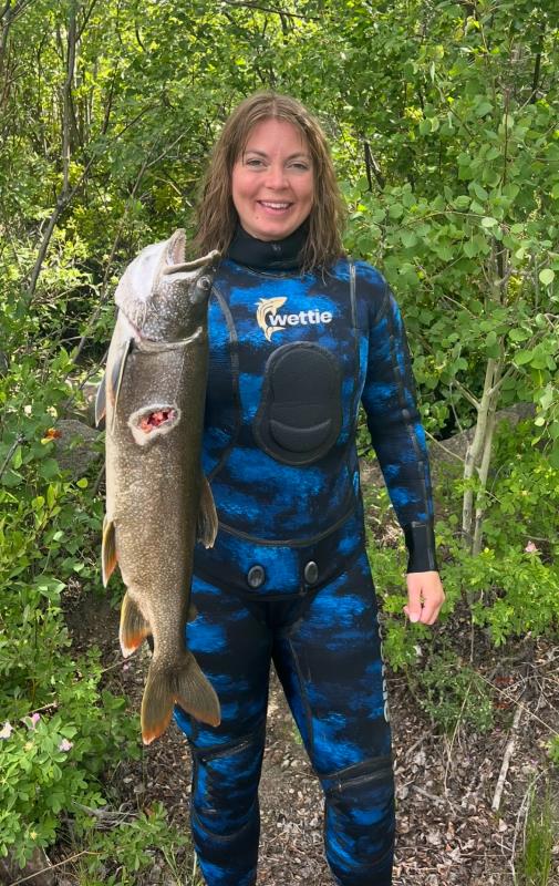 Hunting for Mackinaw is a different experience as they are so predatory compared to some other freshwater species. This is why we were hunting with VersaSpear throw flashers. I threw a flasher and watched it as it spiraled down and dove after it just as it passed by a large boulder I perched on the boulder above where my flasher landed and had another flasher in hand gently waving it to mimic a struggling small fish. It didn’t take long for the trout to come in hot obviously focused in on the flasher in my hand. When the fish noticed I was behind the flasher it turned to check me out giving me the perfect opportunity to shoot. It was a solid shot but I still brought it in slow knowing how soft the meat is on trout. I easily brought it in and dispatched it and started hollering to my husband and dive partner Ryan to come and check it out and get some go pro footage of me and my personal best Lake Trout. Also shout out to my good friend Emily, I know this just barely passes yours and have no doubt we will both be shooting larger soon ;).