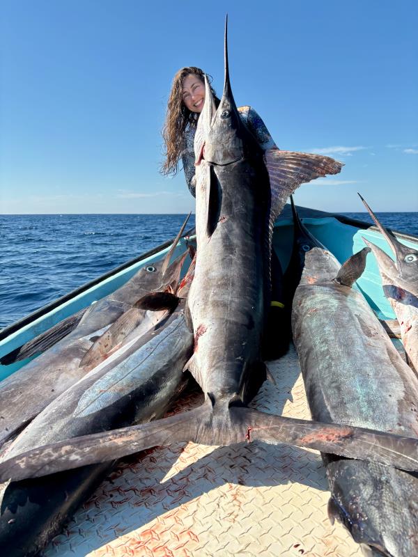 I dove down behind a sardine bait ball, awaiting the biggest marlin to crash through and predicted it would turn broadside to avoid hitting me for a 1 second opportunity to be within 2 feet of it. This is the proximity required for a lethal shot with a polespear. I shot it deep in the neck, hitting the spine and paralyzing it instantly. This was a 1/1000 chance, and I didn't believe it, so I poked the fish to make sure it wasn't just temporarily stunned and about to give me a long ride down. It was immobile like a door. On the same breath, I pulled it to surface with one hand while holding my spear with the other as it was rigged as a breakaway tip and I couldn't let go of either. The amazing new four spearing friends from Brazil I had met the day before just stared at me with their mouths open on the boat. I yelled "Ayuda mi, putos!" which means "Help me, bitches!" hoping that the captain would steer the boat over to me, so I didn't have to swim the fish far. One replied, "I don't think you need our help." I used an 11 foot carbon fiber RedTide roller polespear with a slip tip attached as a breakaway to a 50 foot floatline for less drag and a 3 ATM float.