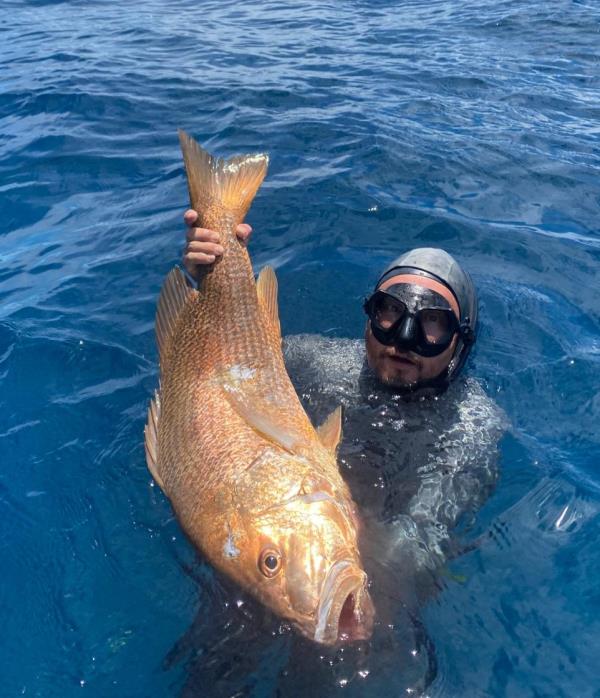 It was a challenging but pleasurable hunt on a wreck I witnessed sink around 10 years ago. I still remember the day, I was up in a tree picking Rambutan when I saw an explosion in the distance. A pleasure yacht had caught fire and sunk, at that moment I knew that the wreck would provide good food for the village for years to come. Fast forward 10 years, my dive buddy had arrived the night before, the boat was hooked up and ready to go, but there was an important task before we departed. One strong black coffee, two cigarettes as I sat on the toilet gazing up at the coconut trees, there was not a breath of wind. It was going to be a good day! After beach launching the boat, our first dive session was fruitful, we already had a good fingermark in the boat, but it was not enough. So we headed to deeper water. My dive buddy had already shot one of our target species, so I just wanted to have look, I laid on the bottom to observe what was once a luxury yacht then the fish just presented itself, so I shot it on its spine, but the slip tip did not engage as it bounced off the bone, so I chased it and shot it again stoned, finish end. I will never take a fish like this again, as a trophy. This strong and beautiful fish will be consumed and celebrated by the rainforest tribe.